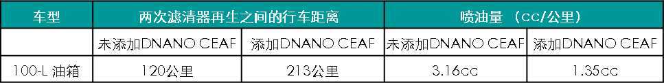 采用日本五十铃100-L油箱的卡车,评估添加纳诺泰克® 纳米燃油助燃剂的清洁柴油对于碳微粒滤清器再生的影响,结果表明使用添加了纳诺泰克® 纳米燃油助燃剂的绿色柴油的卡车,可显著提高两次滤清器再生之间的行车距离,以及降低滤清器再生过程中的喷油量。